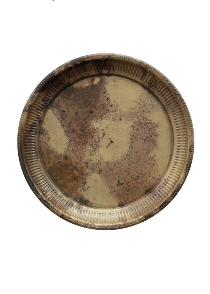 This decorative debossed metal tray in burnt brass finish is a stunning and sophisticated piece that will enhance the home decor. The tray features a burnt brass finish that adds some warmth and elegance to any space and is made of durable and high-quality metal, with a smooth surface. The tray is ideal for serving drinks, snacks, or displaying candles, flowers, or other decorative items. It is an elegant and versatile piece that can complement any decor style and occasion. The tray measures 14.5 inches in diameter.