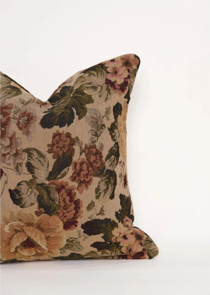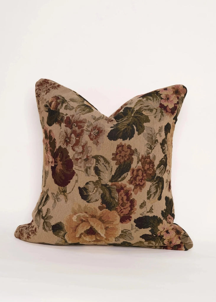 Amelia is one of the reversible tapestry jacquard pillows in the Twenty Third by Deanne European Romance collection. You get two pillow covers in one: one side is a passionately woven botanical tapestry design, reversing to a reddish hued floral design with maroon velvet piping. Reminiscent of vintage paintings and tapestries, this luxurious pillow cover is a one-of-a-kind statement piece that provides character and texture to any space. The cover is offered in the sizes , 18"x 18" and 22" x 22"