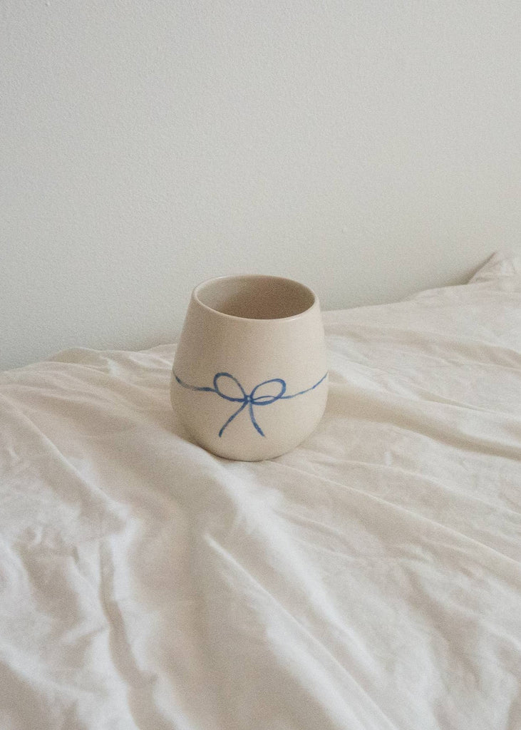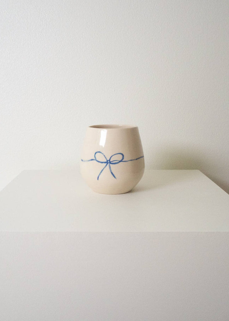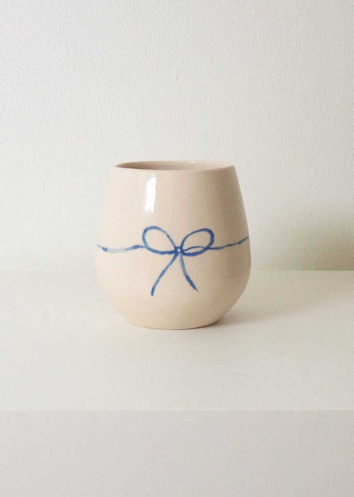 Shop ProvisionA handmade ceramic cup designed to emulate a stemless wine glass. Made with white stoneware clay and hand painted This softly rounded cup is the perfect vessel for coffee, tea, matcha lattes, and of course wine. Approx 3.5” height and 2.5” in width Holds approx 10 oz of liquid Microwave safe, dishwasher safe, handwashing recommended.