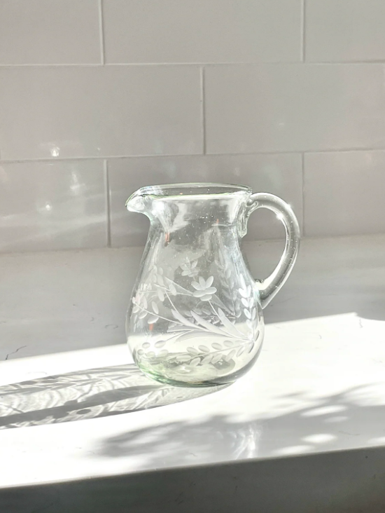 This Hand-Etched Blown Pitcher showcases delicate floral designs intricately etched by skilled artisans. Crafted using traditional glassblowing techniques, it combines artistry with functionality. Ideal for serving beverages or as a striking centerpiece, its detailed floral etching adds a refined elegance to any setting, reflecting expert craftsmanship and timeless style.