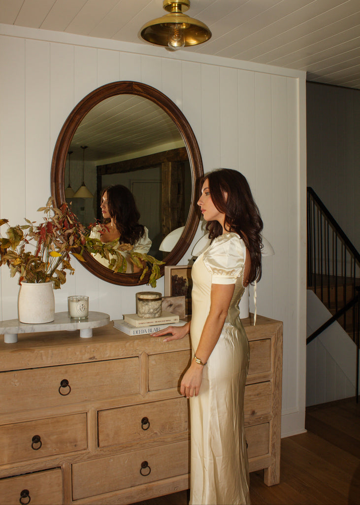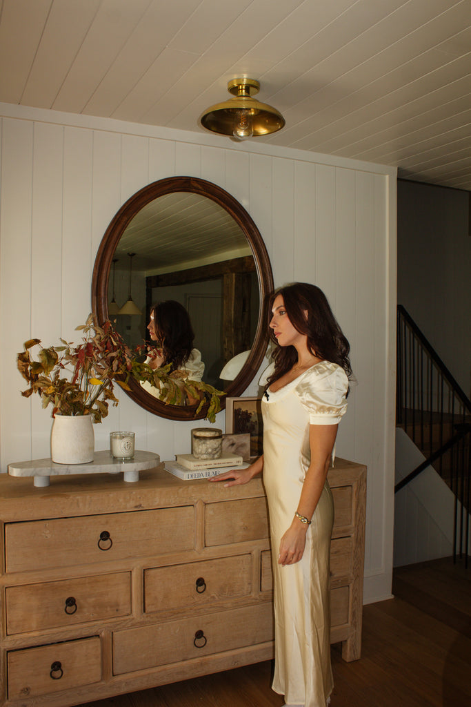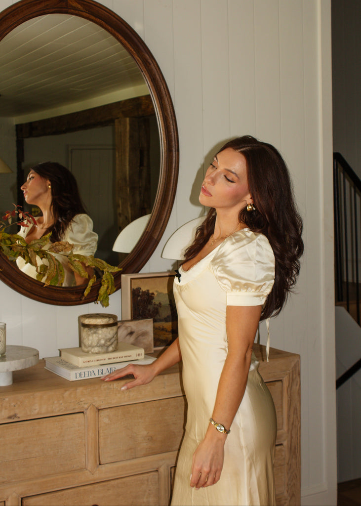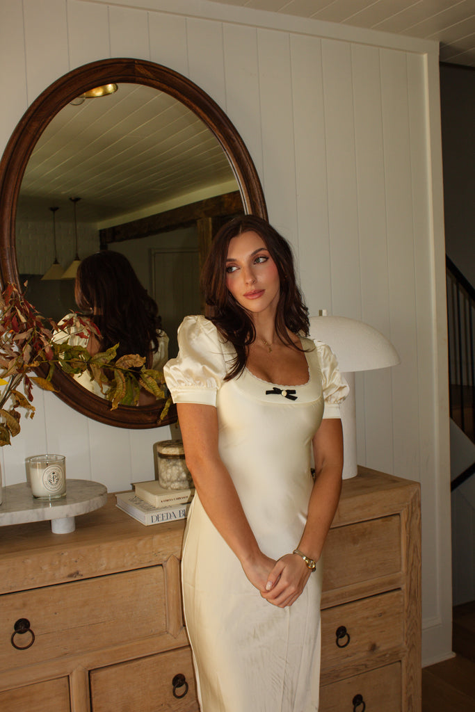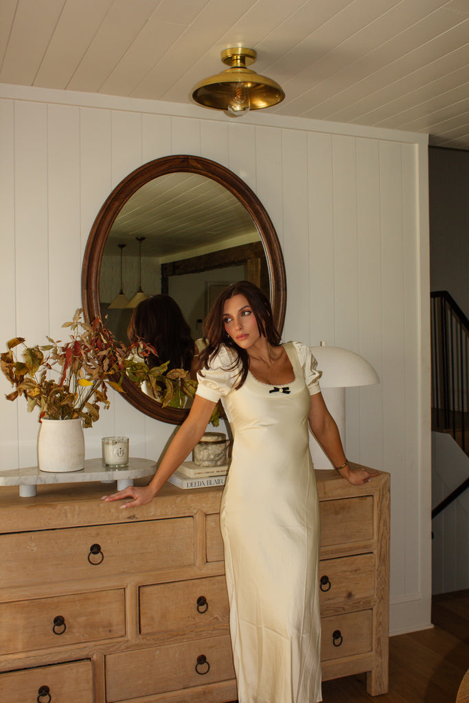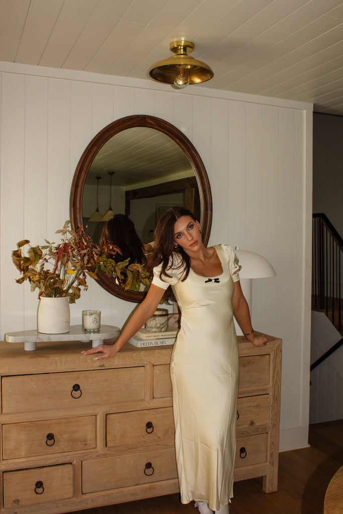 The Eliza Dress is a graceful midi-length piece in a soft cream hue, designed with a charming bow and flower detail at the front of the neckline for a feminine touch. The delicate lace neckline adds an elegant, romantic feel, enhancing the dress’s timeless appeal. Perfect for special occasions or dressed-up daytime events, the Eliza Dress combines classic style with intricate details for a sophisticated, flattering look.