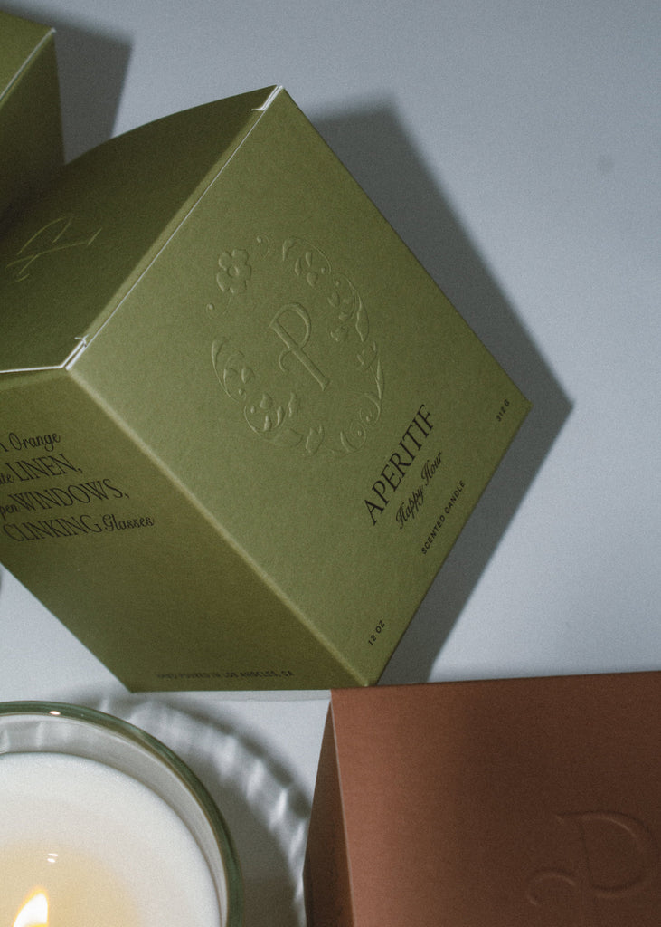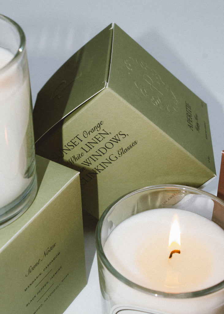 The Aperitif Scent is a blend of Mandarin, Cardamom, Black Pepper, Jasmine, Sandalwood, Patchouli, and Musk.