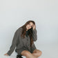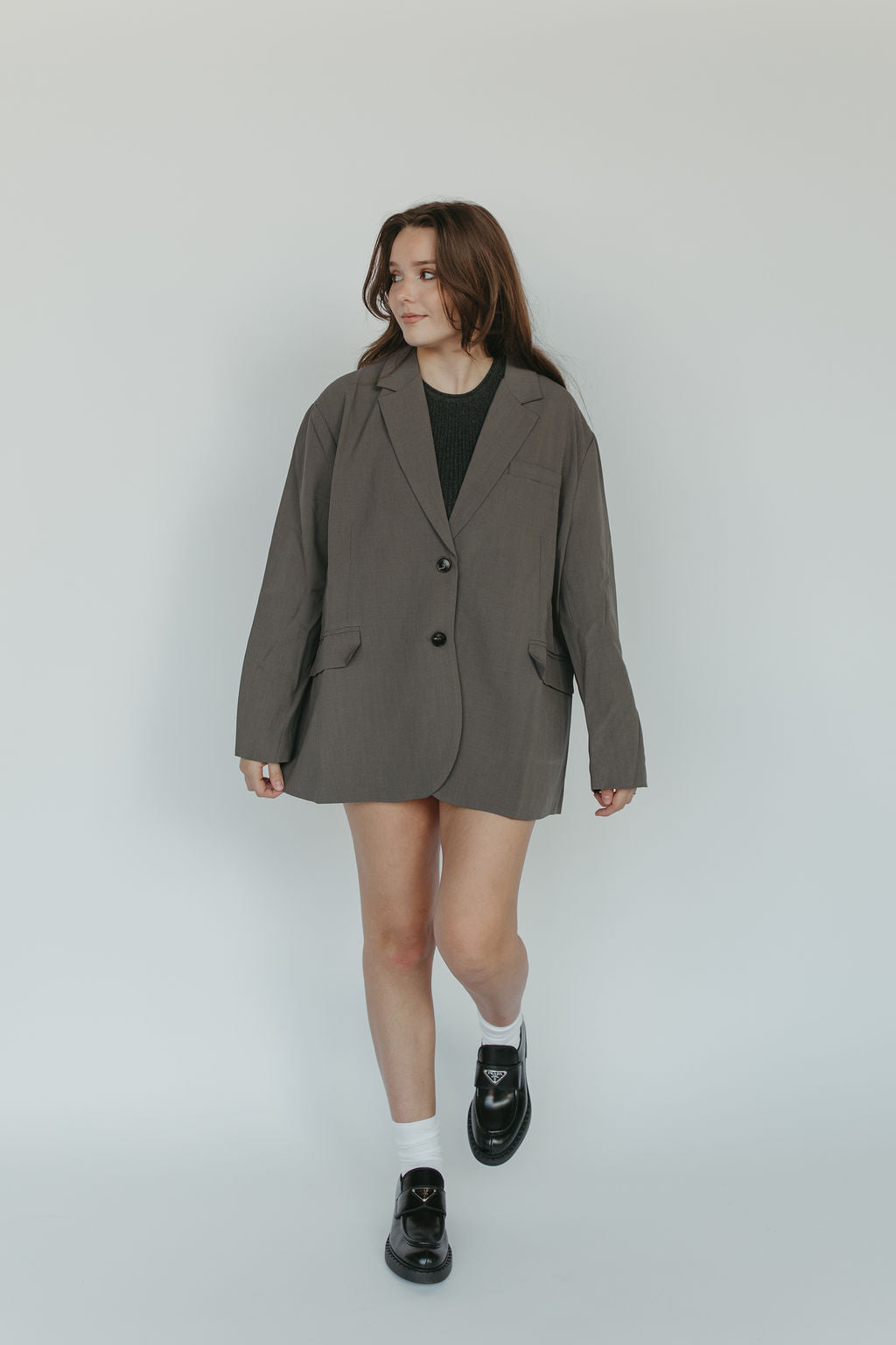 The perfect oversized boyfriend blazer for the colder seasons! Available in Sage and Charcoal. Model wearing size M/L for dress fit.